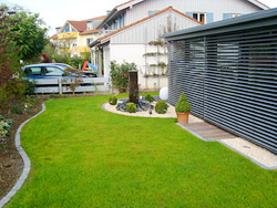 Entfernen der bisherigen Bepflanzung, Geländemodellierung, Höhersetzen der Sträucher und Pflanzen, Einfassung der Beete ausgeführt als Mähkante: dies gewährleistet ein sauberes Rasenmähen auch bei geschwungenem Konturverlauf