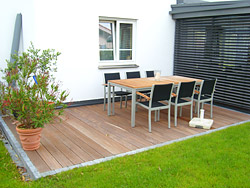 Traufstreifeneinfassung, Bepflanzungsarbeiten (Stauden und Gehölze), Fundament für Holzterrassen, Verlegen der Holzterrassen, Humusplanie, Rasenneuanlage, Pflasterarbeiten, Einfassung des Wintergartens und der Holzterrassen mit dunklen, anthrazitfarbenen Pflastersteinen, um die Farbe des Wintergartens fortzuführen